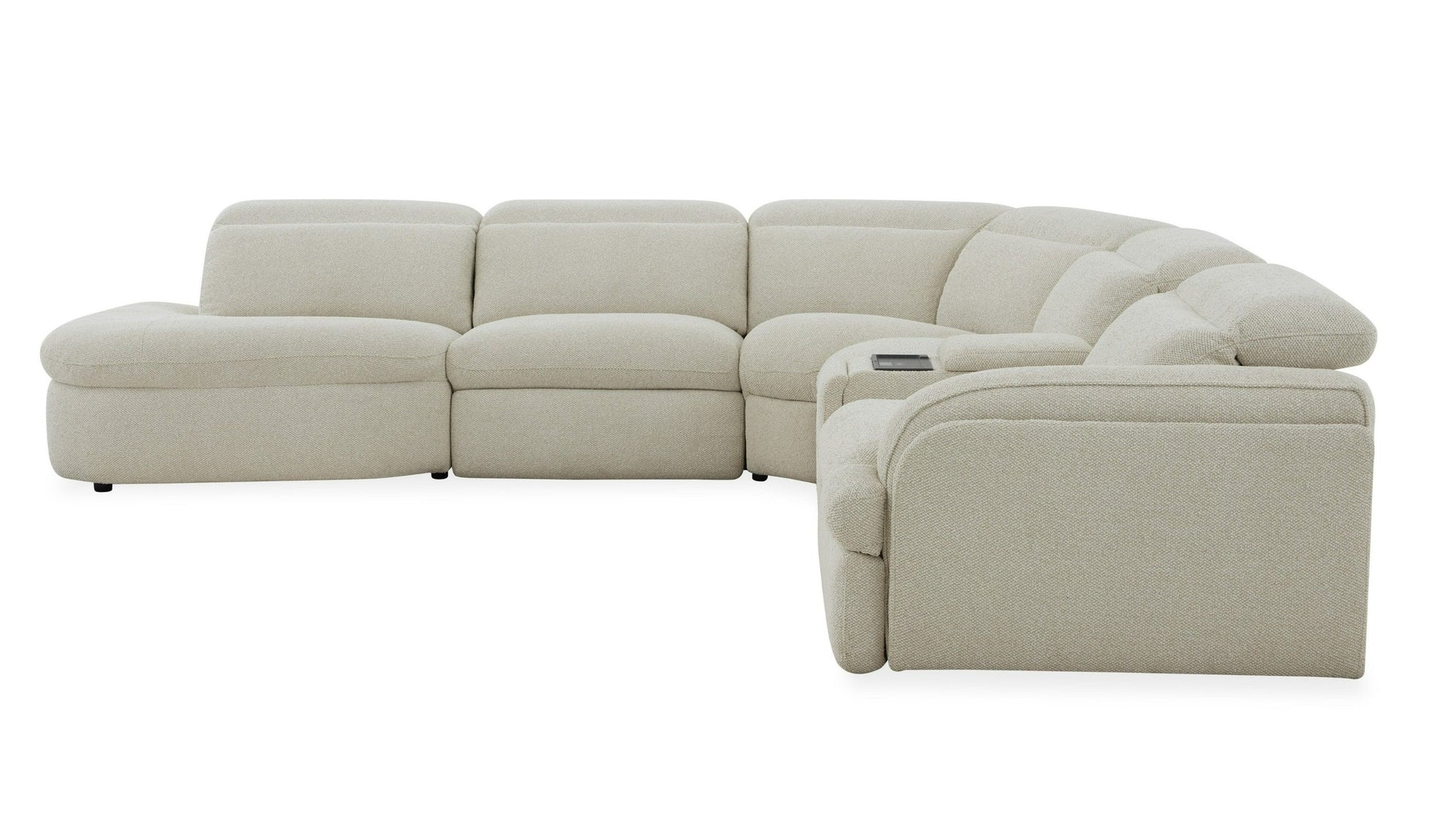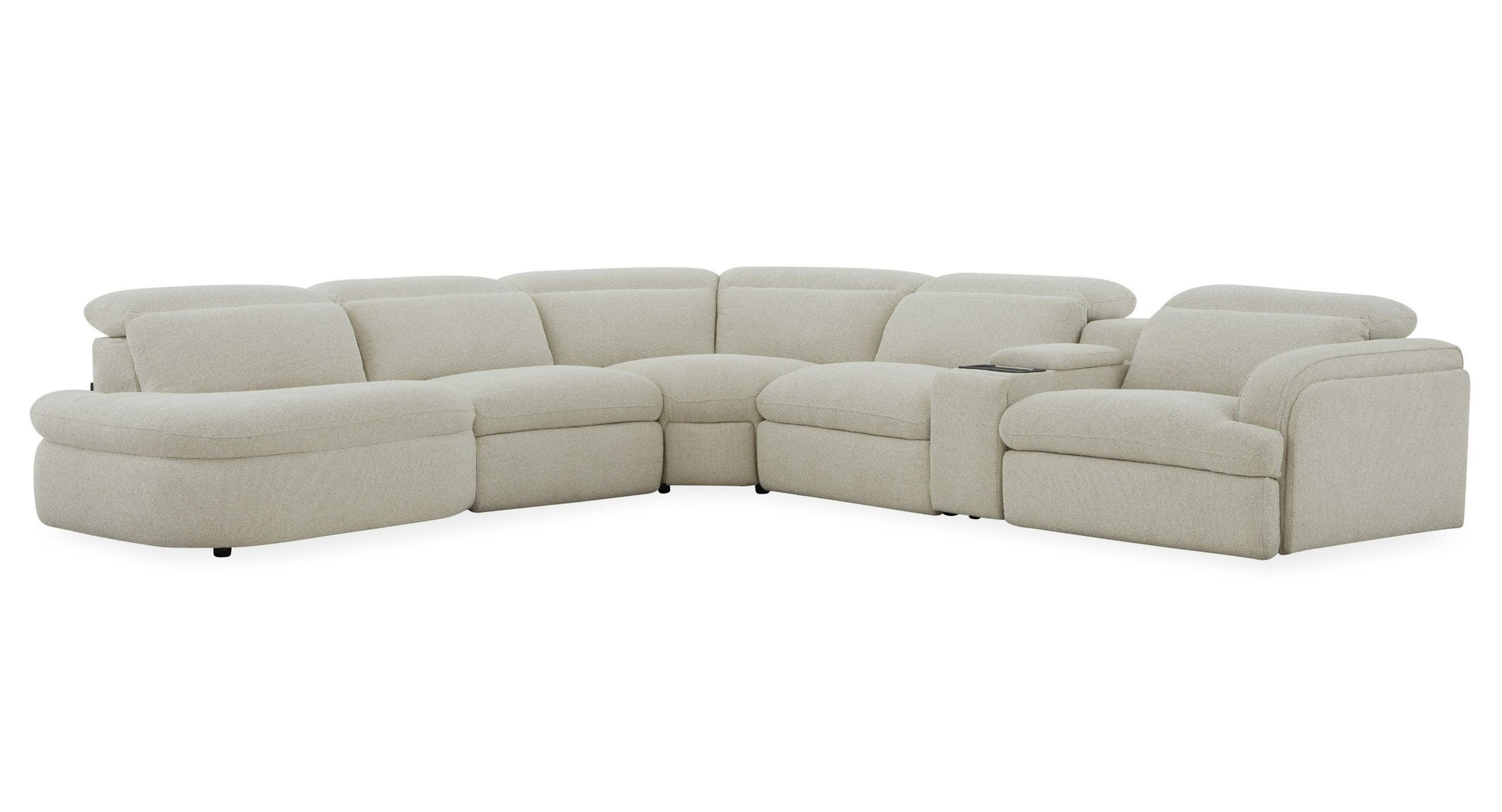 The Ambler Sectional Sofa features an offβwhite fabric upholstery with a leftβfacing chaise and two power recliners. Its modular layout provides seating for living rooms and shared spaces. The design includes adjustable headrests and a storage console to support everyday use. The sectionalβs structure and materials allow it to coordinate with a range of interior styles while offering a functional seating arrangement.