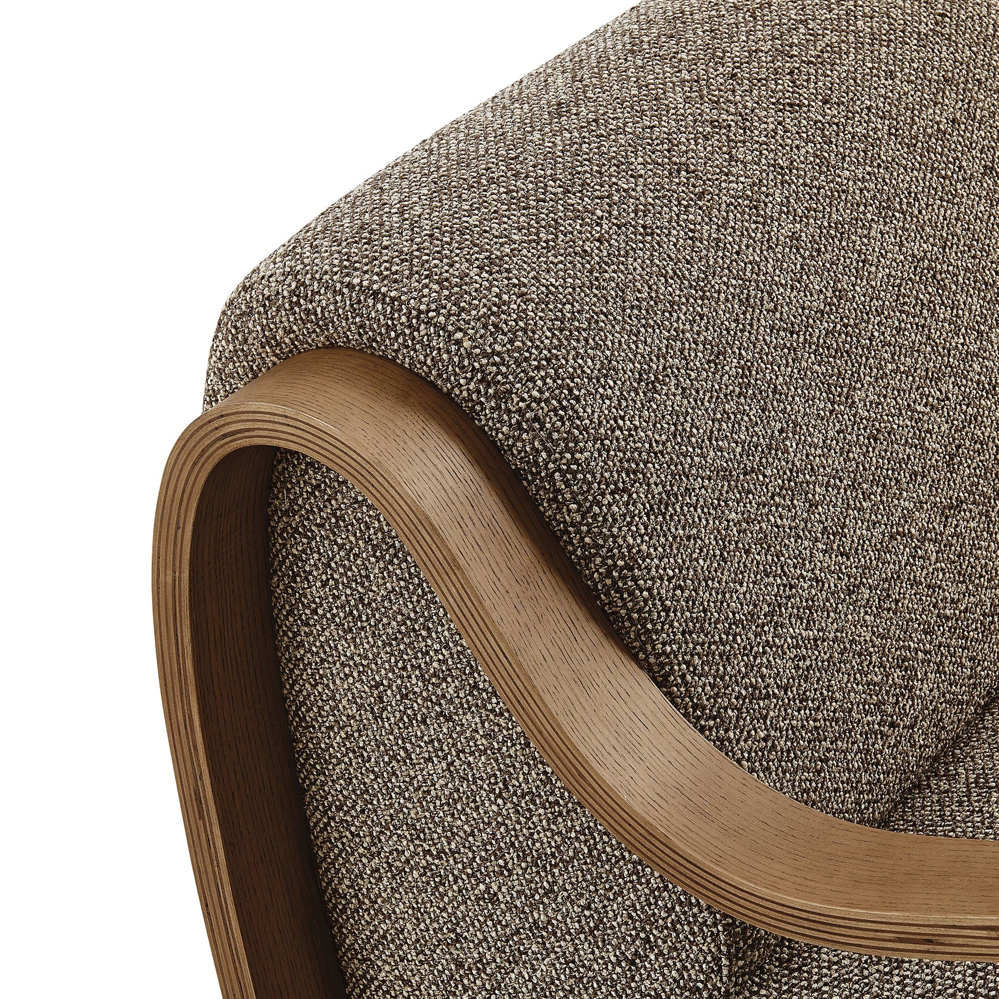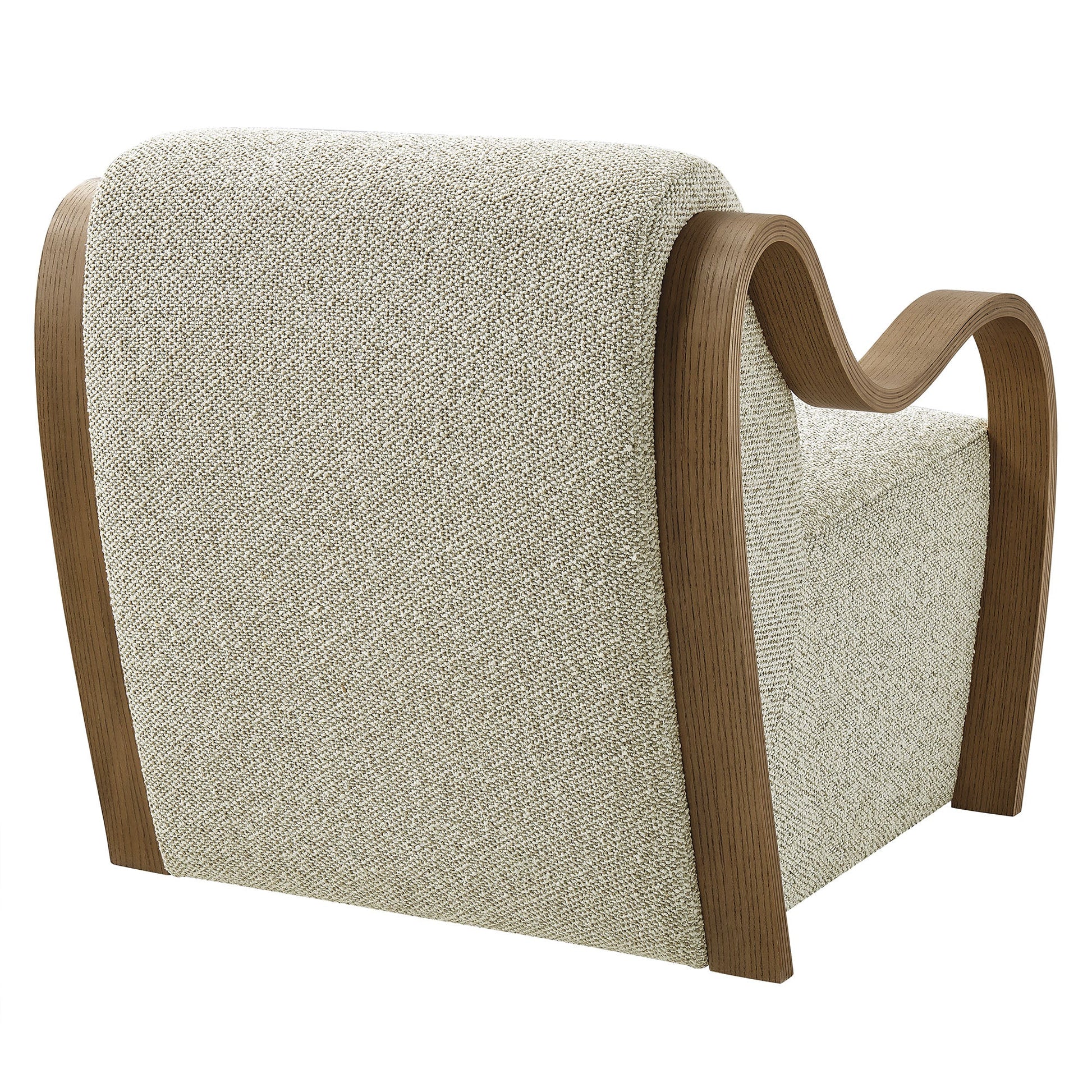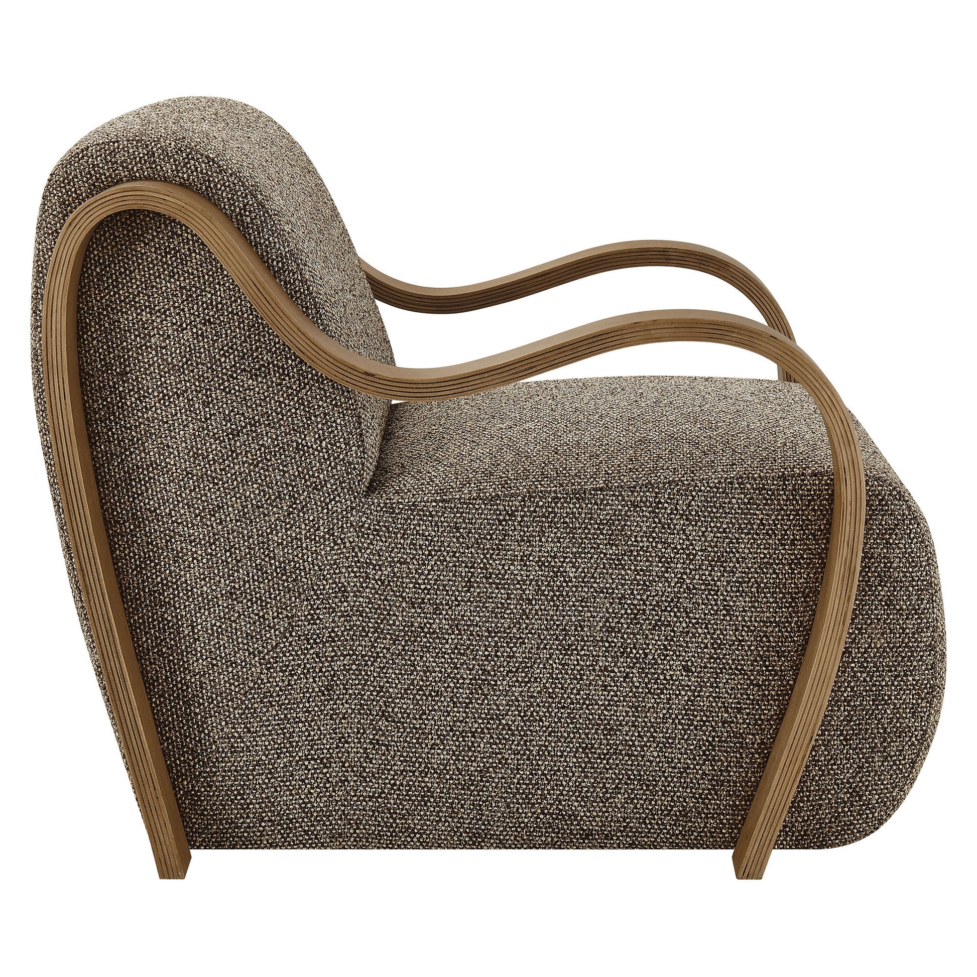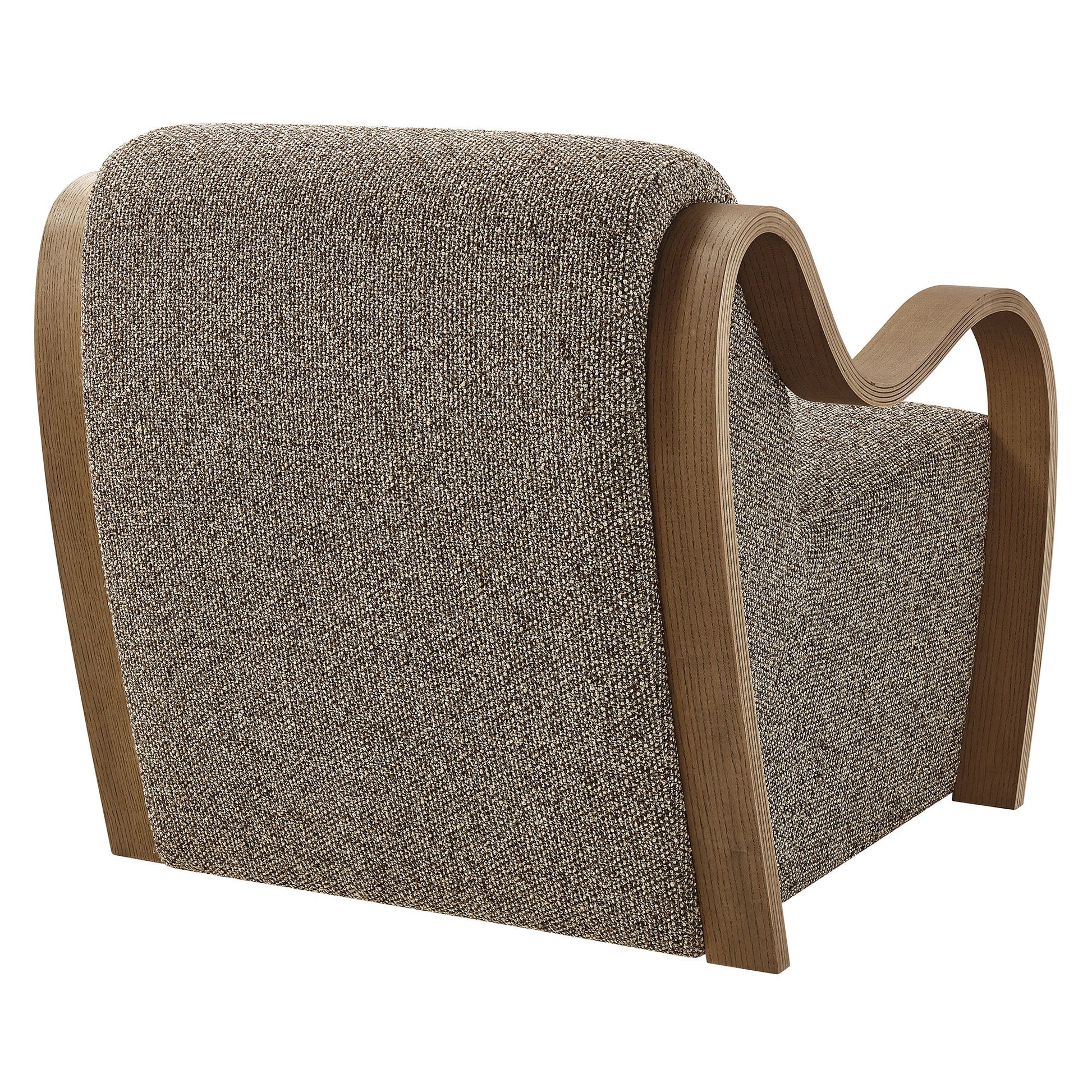 The Atrium Accent Chair is designed with a sculptural form and everyday functionality. Upholstered in lattice boucle fabric, the chair provides a textured surface with a soft feel. The curved seat cushion extends to the floor for a grounded silhouette, while kilnβdried bentwood arms add a midβcentury inspired detail. The chair includes foam padding for comfort and arrives fully assembled with nonβmarking floor pins.