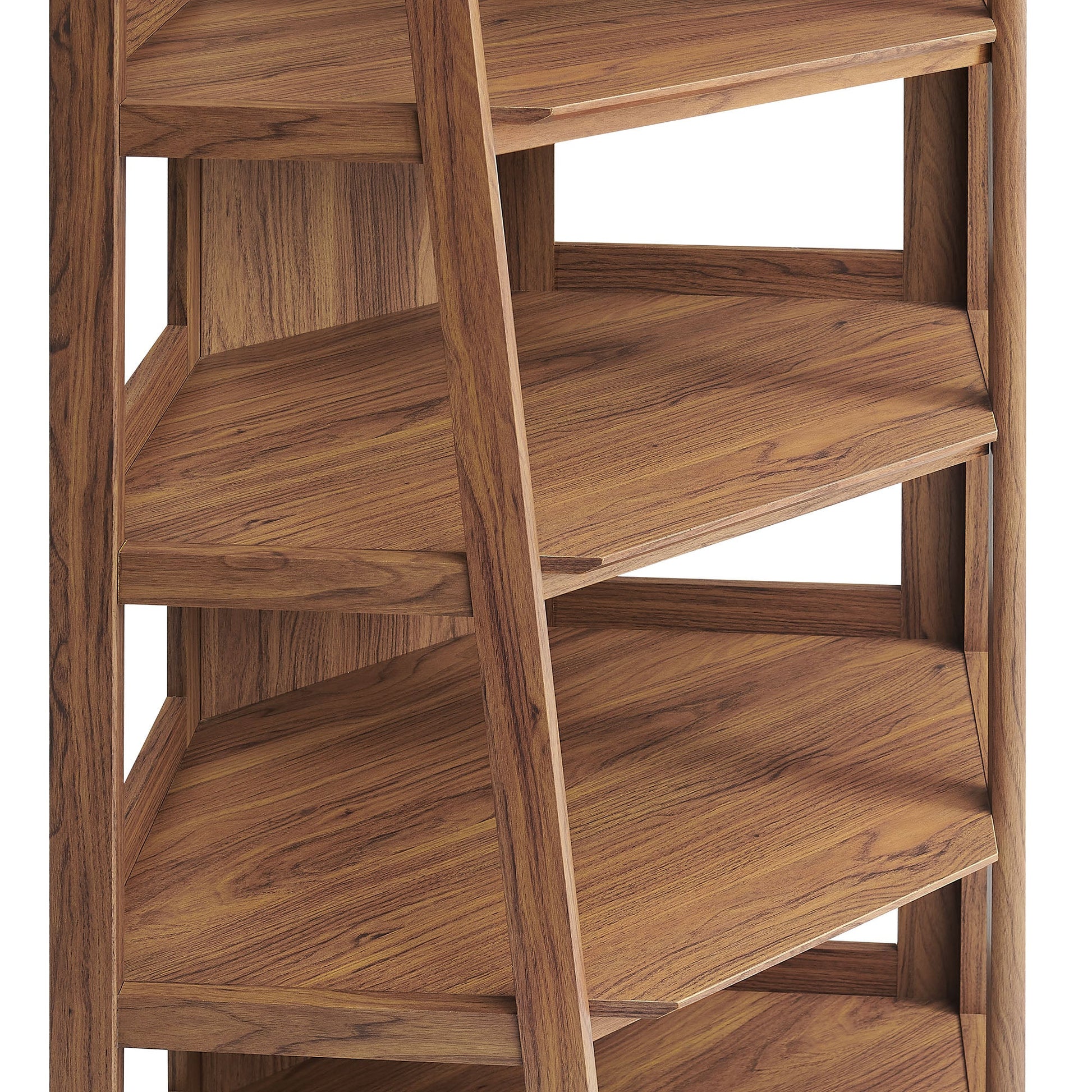 Bixby 71βInch Corner Bookshelf The Bixby Corner Bookshelf features a slim, tiered silhouette designed to fit neatly into a corner. The laminated woodβgrain finish pairs with clean, open shelving for a balanced, modern look. The unit includes five open shelves suitable for books, plants, and dΓ©cor. Angled side supports and windowβstyle panels help maintain a light profile while adding stability. Built from a durable wood blend, this tall bookshelf can stand alone or integrate with other Bixby pieces. Each shelf supports up to 141 lbs.