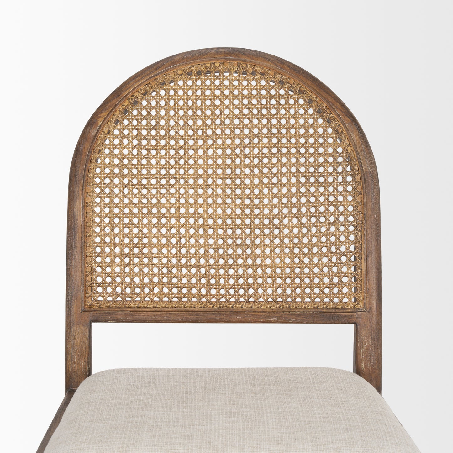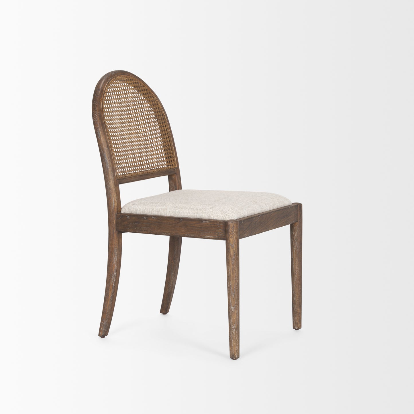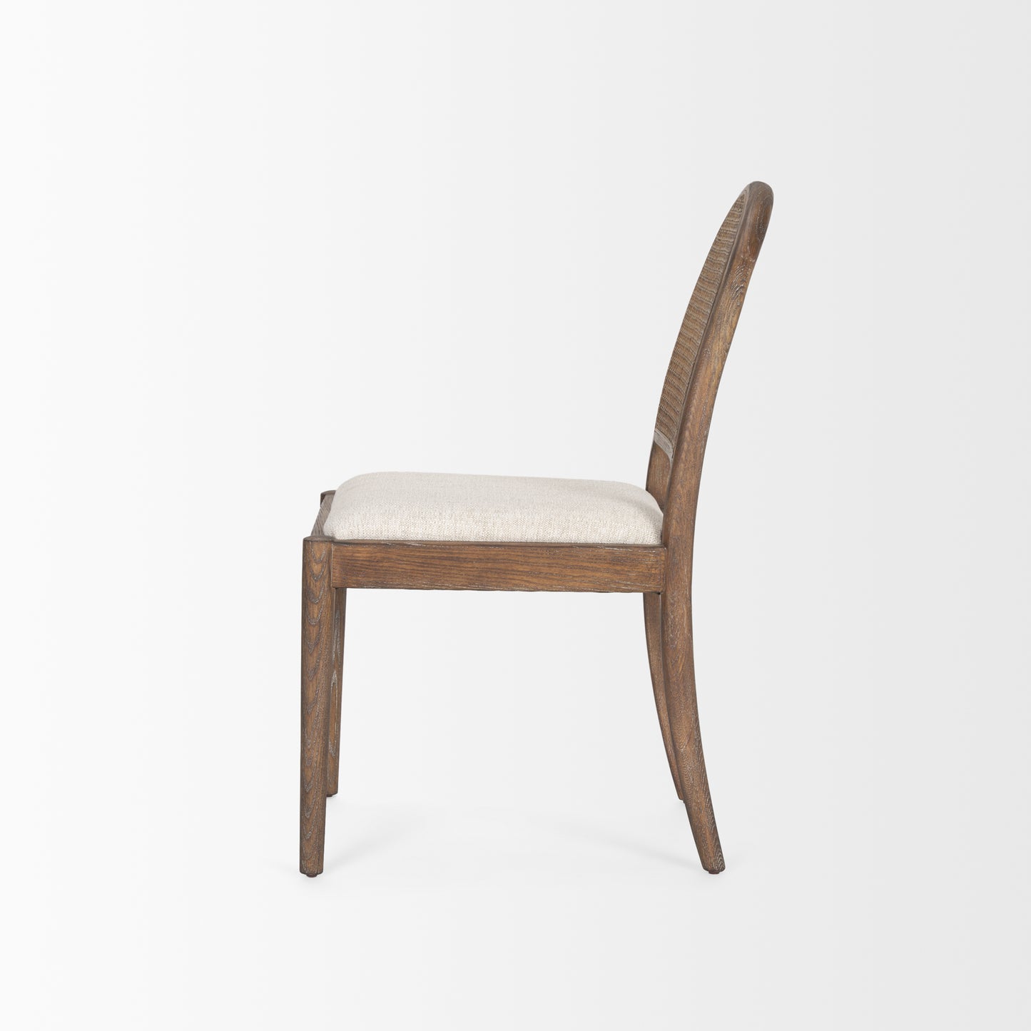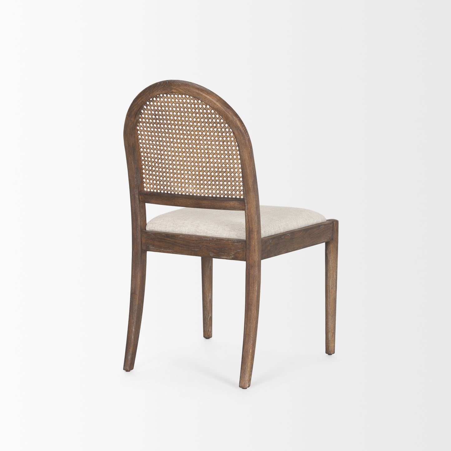 The Elle Dining Chair offers a refined and inviting look with its unique rounded caneback design. Crafted with medium brown wood, this chair features a warm, timeless finish that complements the soft oatmeal fabric upholstery. The combination of natural wood and fabric creates an elegant balance, making it a versatile piece that can complement both traditional and modern dining spaces.