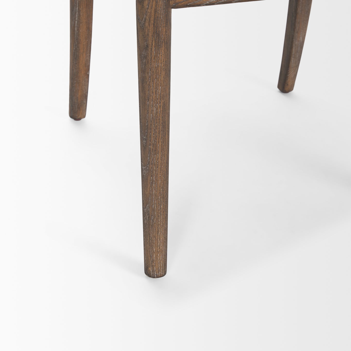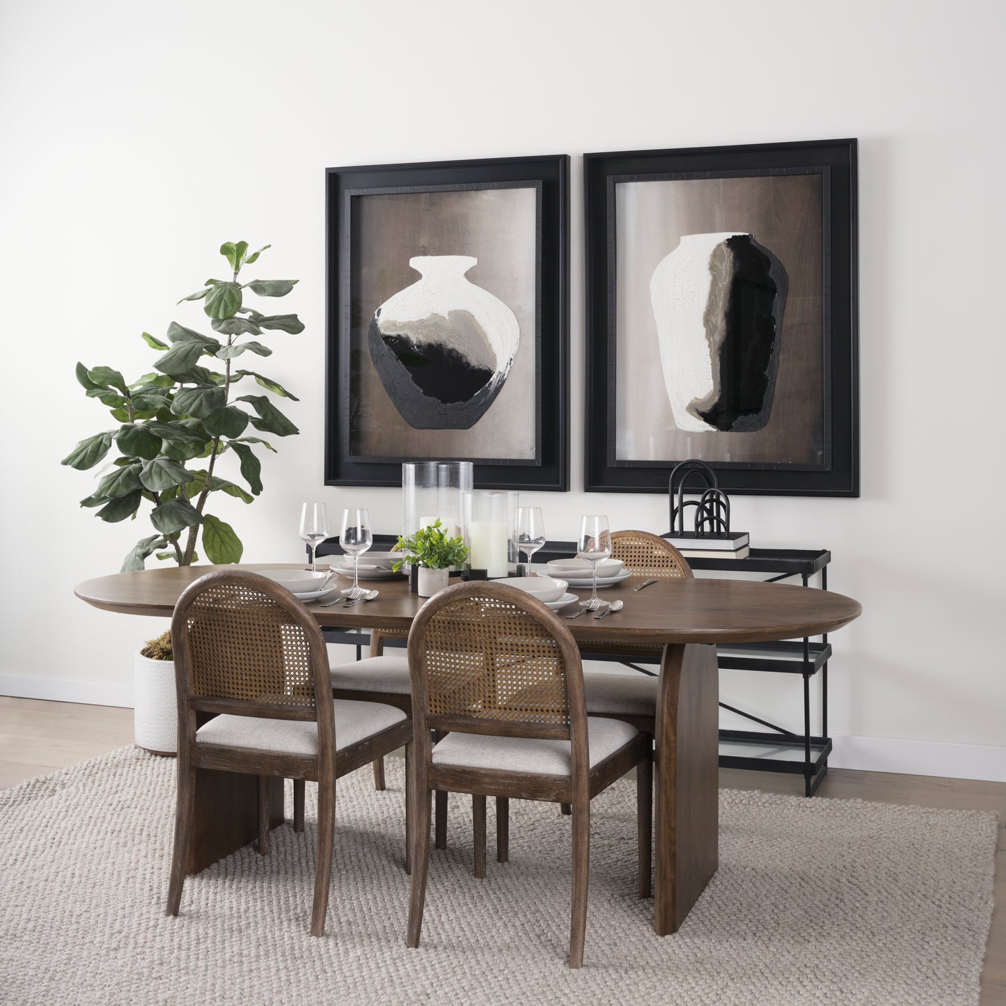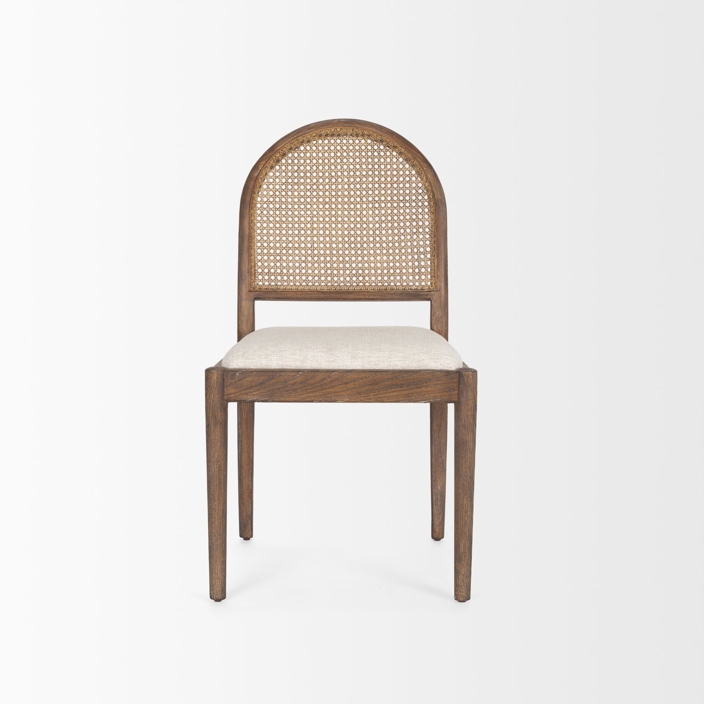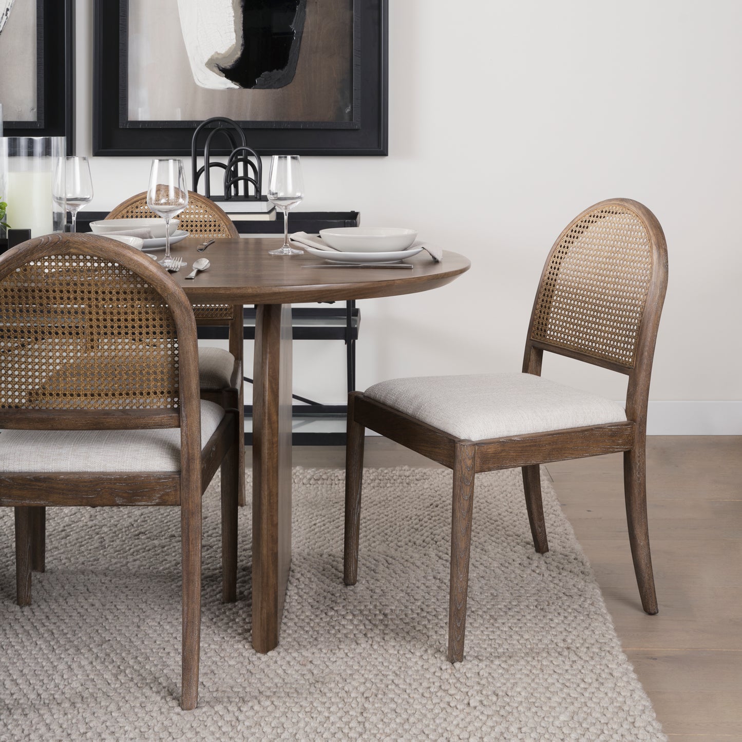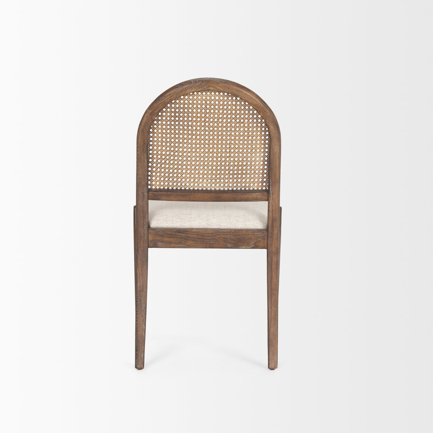 The Elle Dining Chair offers a refined and inviting look with its unique rounded caneback design. Crafted with medium brown wood, this chair features a warm, timeless finish that complements the soft oatmeal fabric upholstery. The combination of natural wood and fabric creates an elegant balance, making it a versatile piece that can complement both traditional and modern dining spaces.