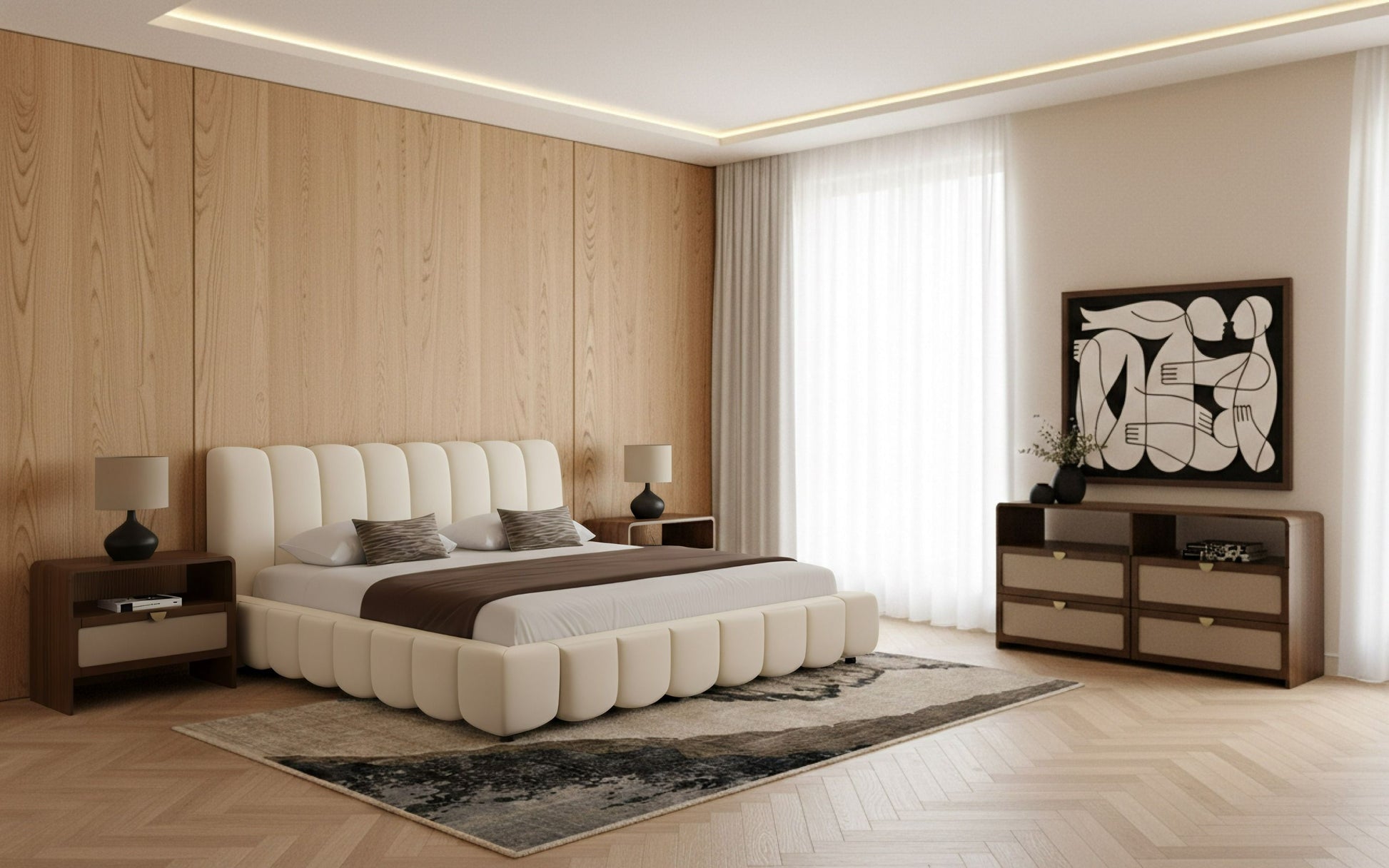 Harris Emilio Modern Off White Fabric Burlap Walnut 4 Piece Bedroom Set