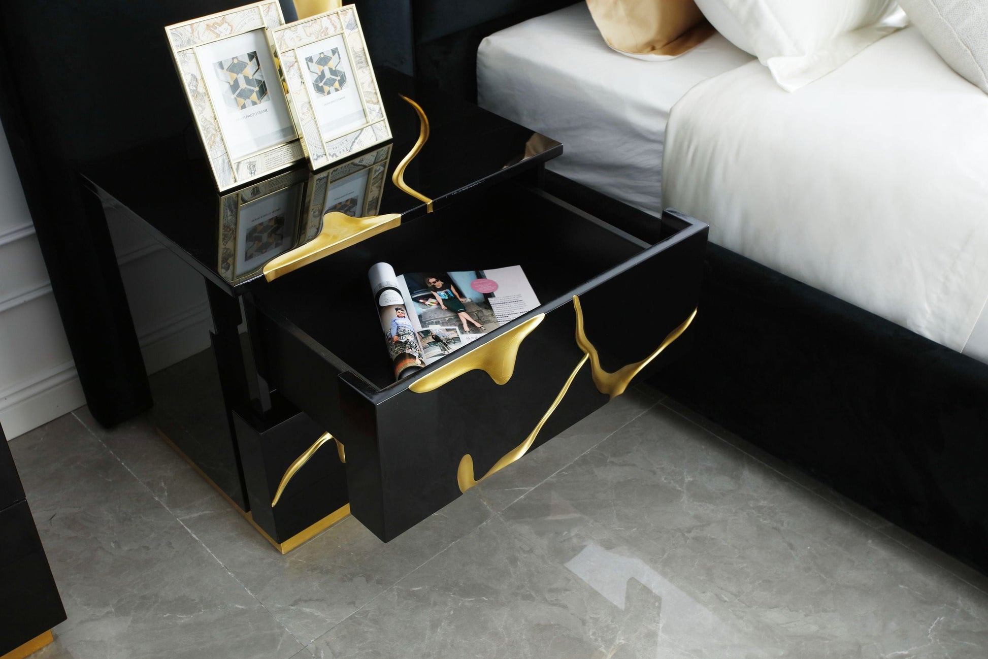 Creative craftsmanship emanates from the Modrest Aspen Modern Black & Gold Nightstand. Featuring a lustrous black high gloss finish, it has two spacious soft-closing drawers with pulls located on its side. Artistic gold-painted accents that simulate tree branches provide visual appeal along with the hefty gold-colored base. Its top is wide enough to accommodate items within easy reach while in bed. Beyond the storage aspect, this fully assembled modern Aspen Nightstand lends your bedroom a lavish, stunning look!