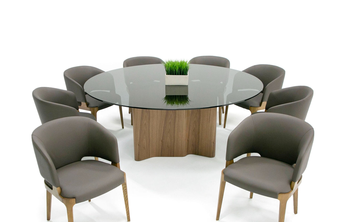 Keywords: modern dining table, round dining table, walnut and glass, elegant design, spacious dining surface, durable construction.