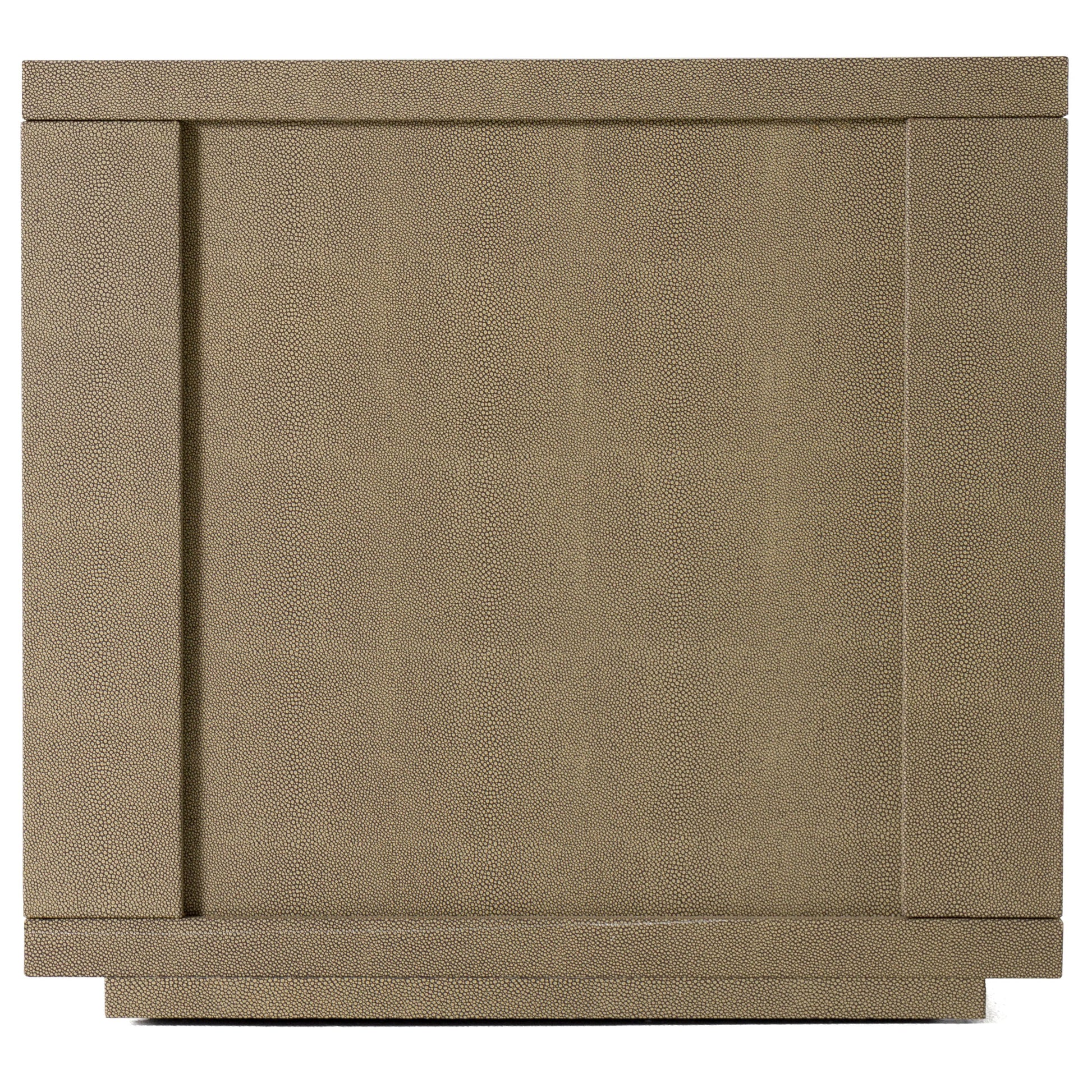 The Lois nightstand features a modern silhouette with beige faux shagreen paneling and elegant brass accents. Its compact structure and drawer storage offer stylish functionality for bedrooms or living spaces. Designed for everyday use and visual sophistication, this nightstand blends luxurious textures with contemporary elegance.