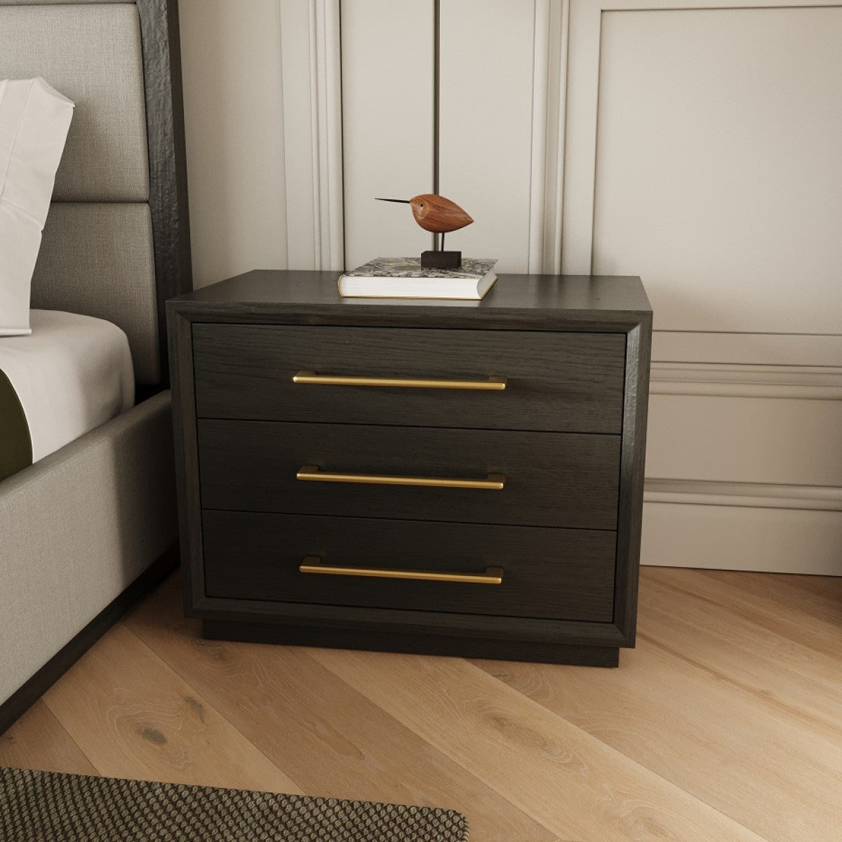Keywords: contemporary nightstand, grey and gold furniture, stylish bedside storage, modern bedroom decor, practical organization, durable construction, elegant design, versatile furniture.