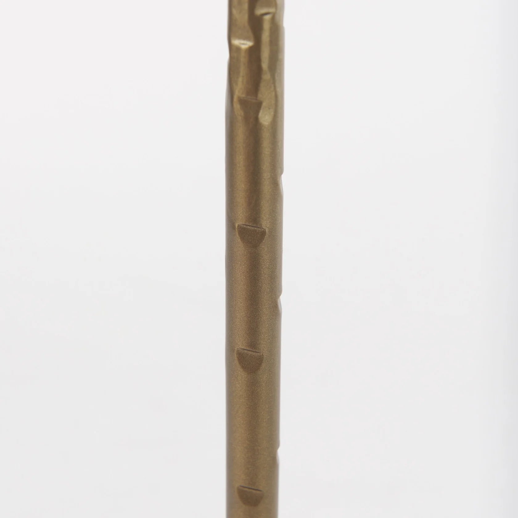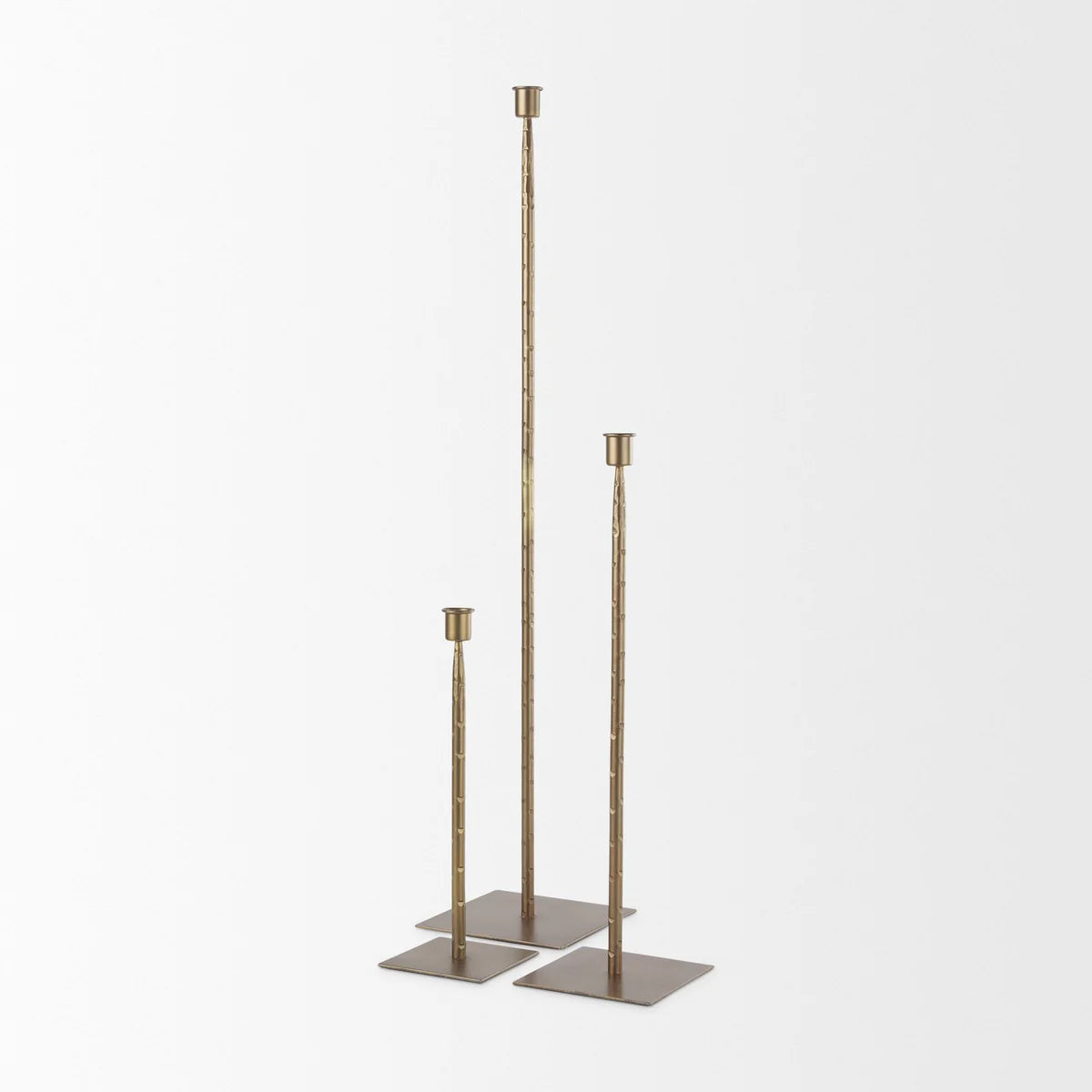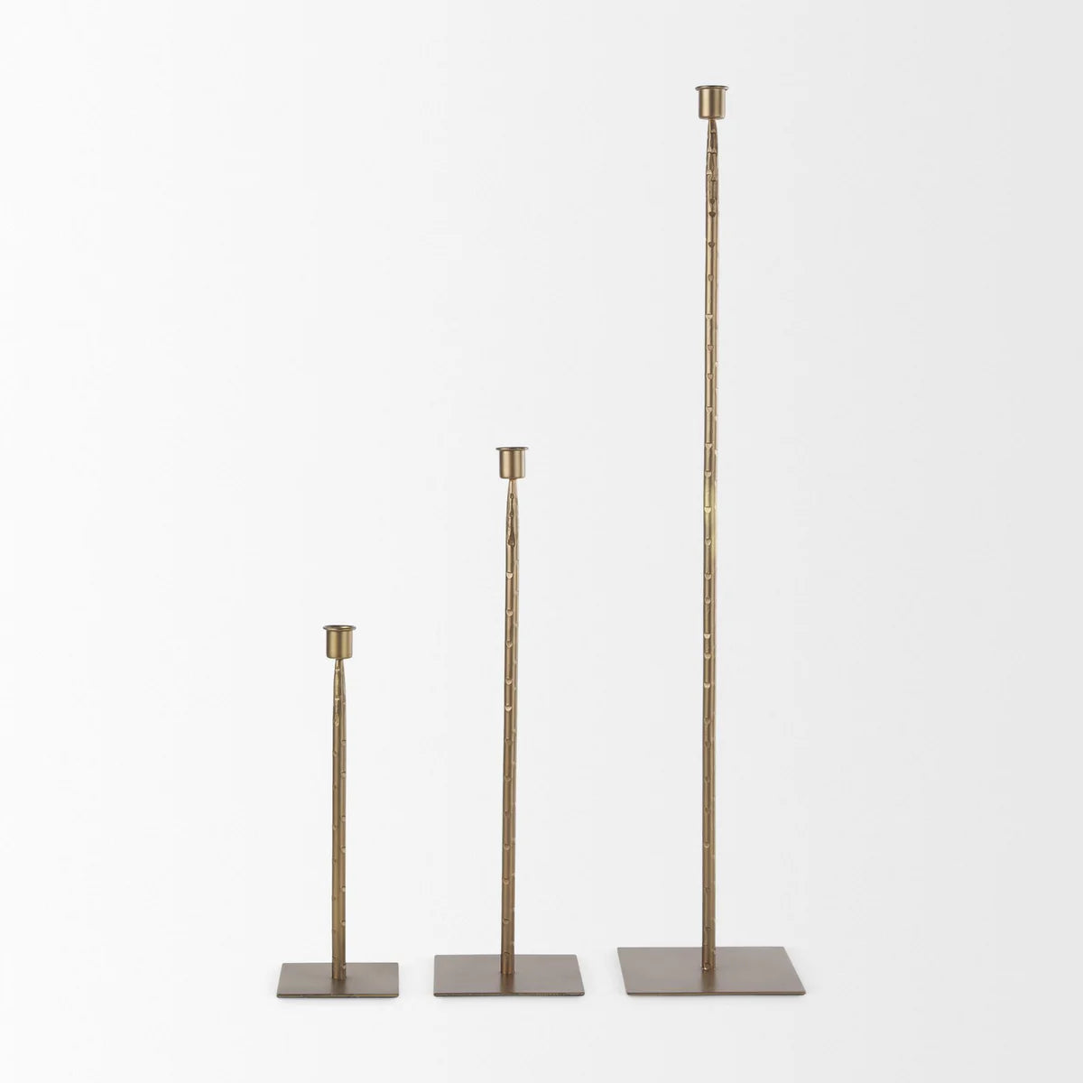 The Porter Candle Holder is a compact decorative accent made from iron with a gold-colored finish. Its textured surface and vertical form make it suitable for displaying taper or pillar candles on tabletops, mantels, or shelves. Designed for indoor residential use, this candle holder adds height and metallic contrast to a variety of interior styles.