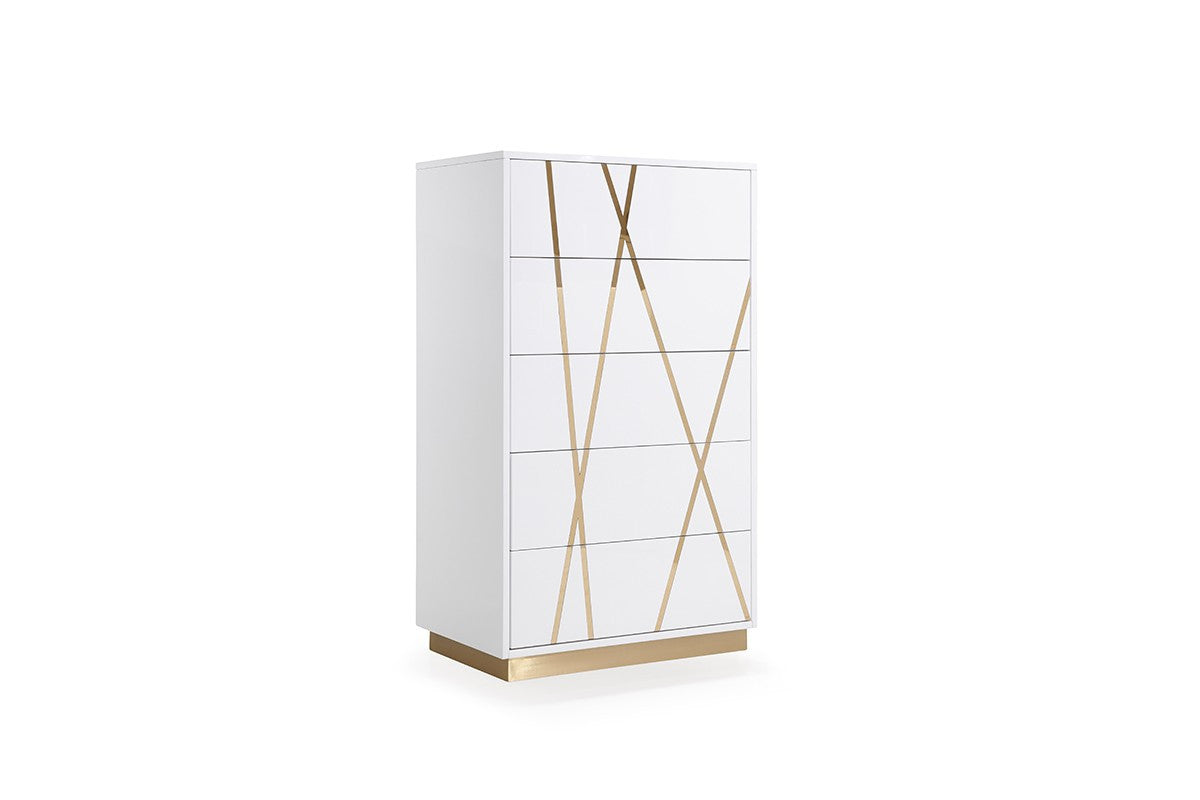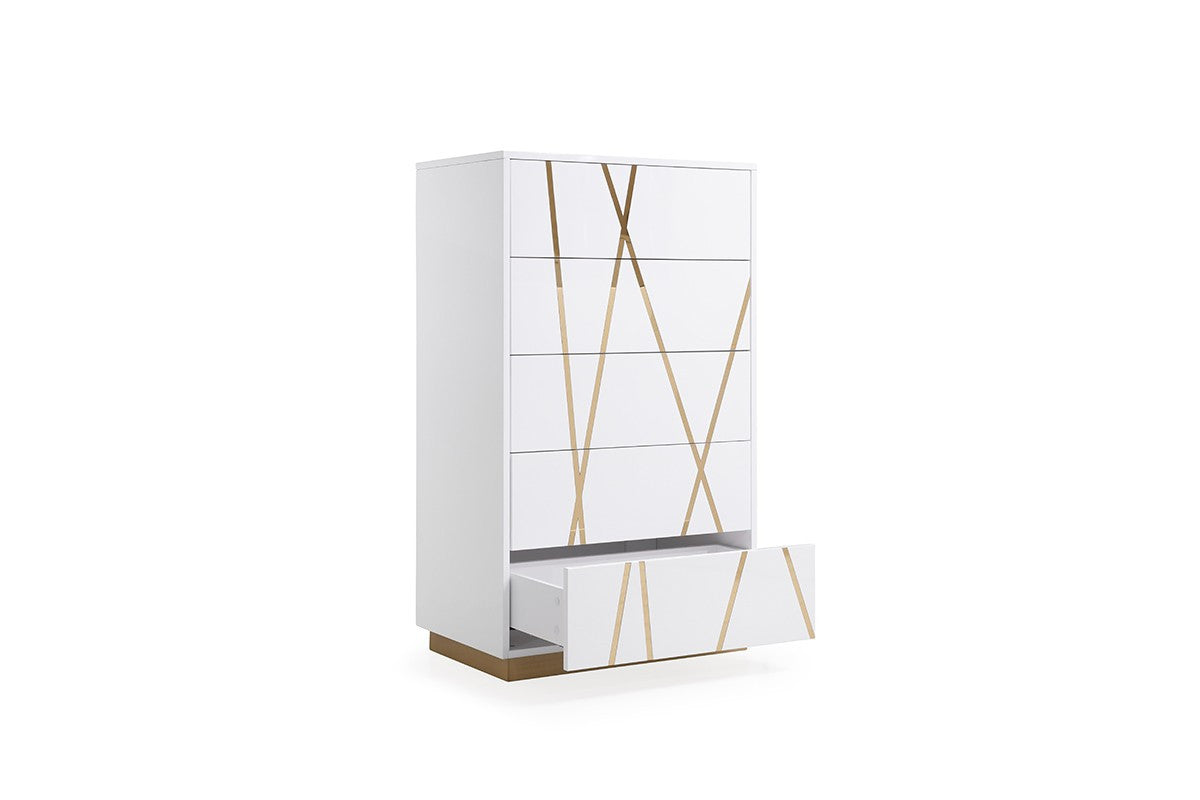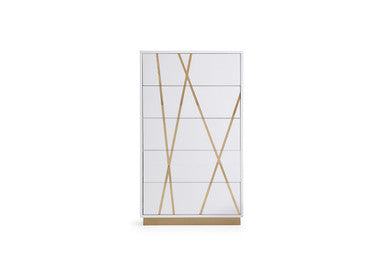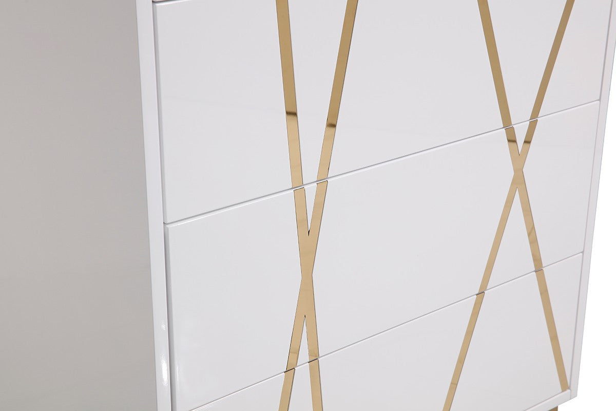 The Modrest Nixa Modern White & Gold Chest exudes elegance and sophistication with its clean white finish and luxurious gold accents. This contemporary chest offers spacious storage with its sleek drawers, providing a stylish solution for organizing your essentials. The combination of crisp white surfaces and bold gold hardware gives the piece a glamorous, modern appeal, perfect for enhancing any bedroom or living space. With its refined design and functional versatility, the Modrest Nixa Chest adds a touch of luxury and modern charm to your home.