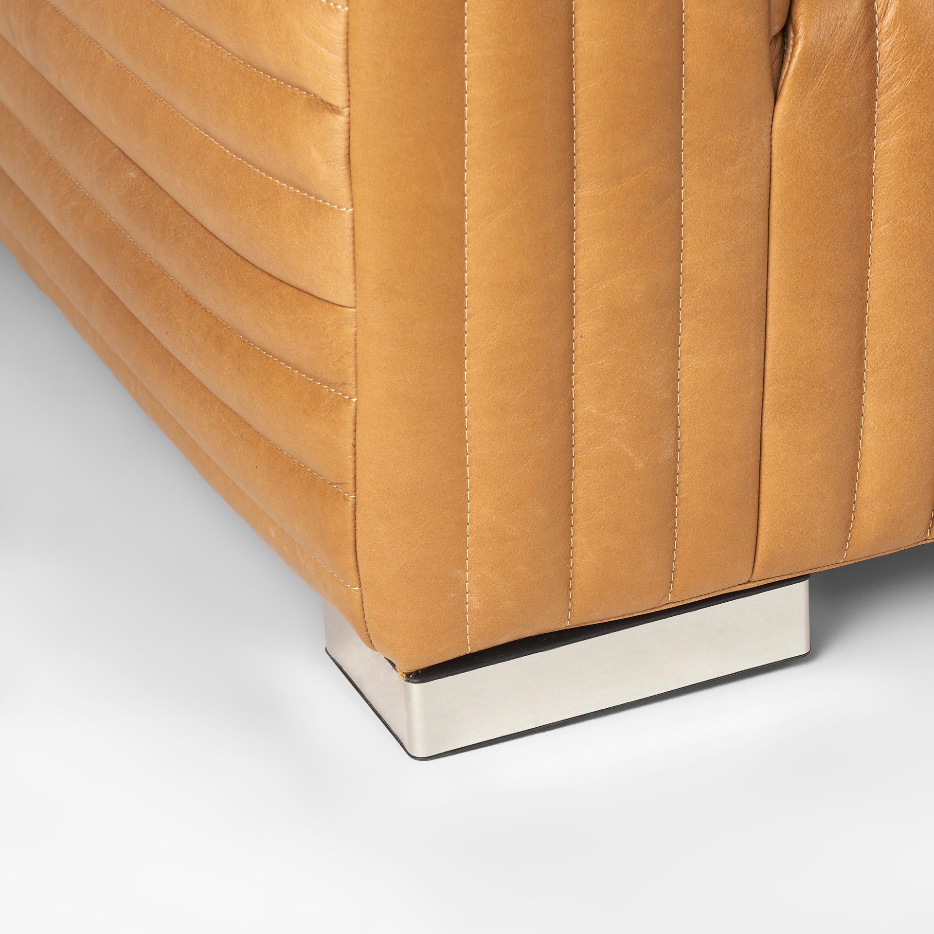 The Ricciardo Cognac Leather Upholstered Arm Chair features rich cognac topβgrain leather with stitched ribbed channels that create a textured, sculptural appearance on all sides. The deep seat is supported by slim square chrome feet that add a modern contrast to the warm leather tones.