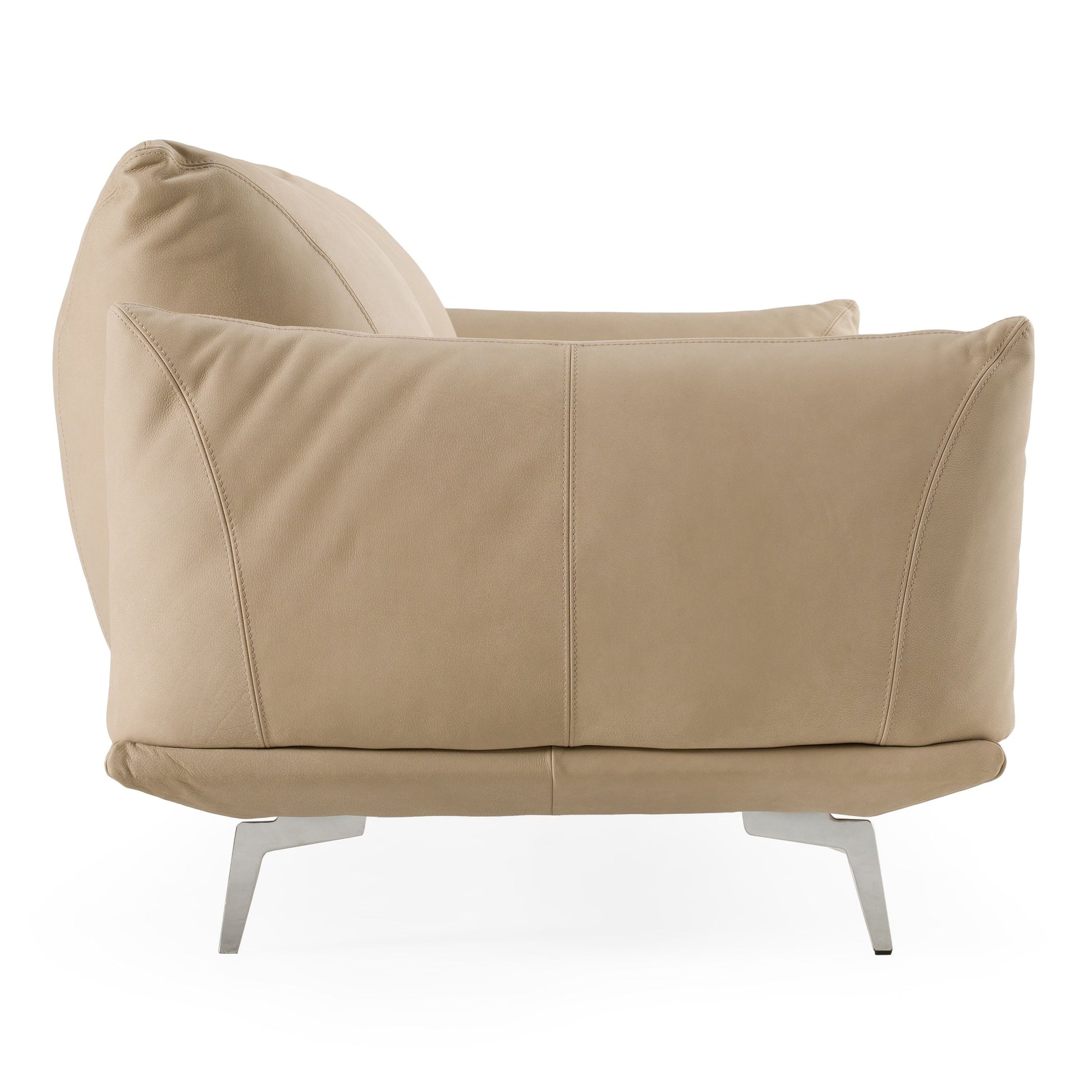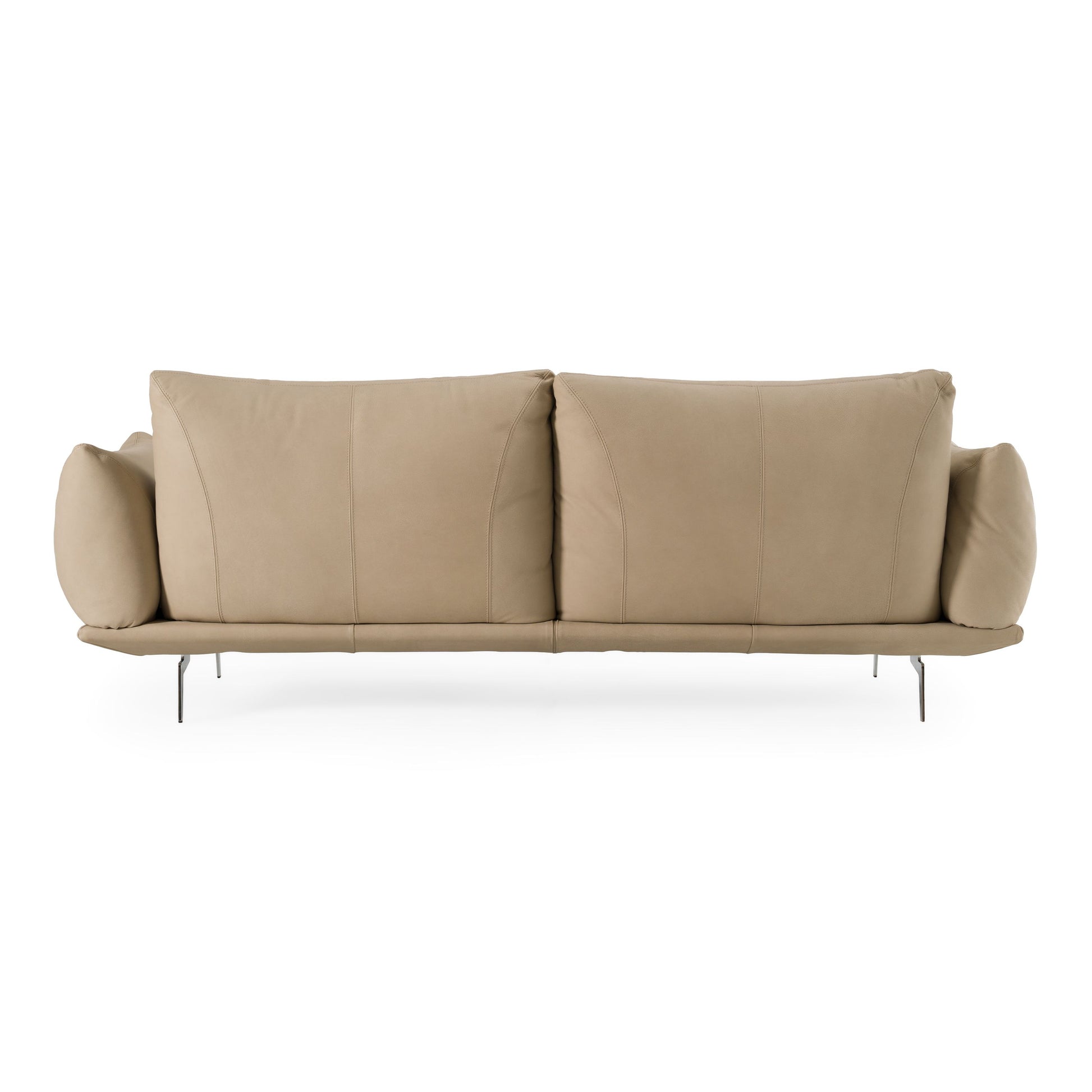 The Saint Tropez Sofa is upholstered in beige Italian leather, providing a smooth and consistent seating surface suitable for everyday use. The frame is constructed with solid pine and manufactured wood to support its structure, and the stainless steel legs offer additional stability. Its straightforward form allows it to fit into a range of interior layouts without relying on decorative or subjective claims. Designed for functional seating, it maintains a simple profile appropriate for living spaces.