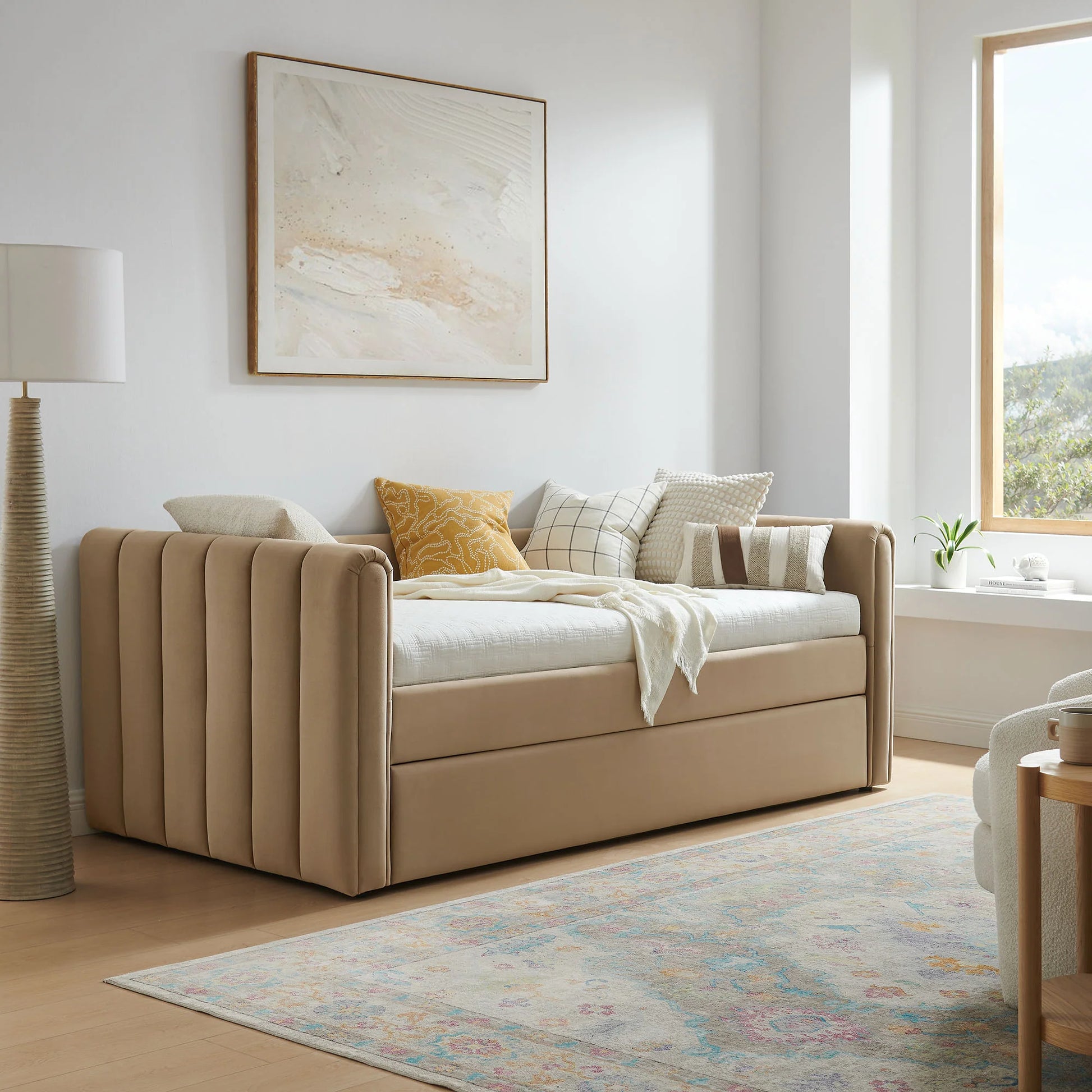 Featuring elegant channel tufting and a streamlined silhouette, the Veyla daybed provides comfortable seating by day and easily converts into a twin sleeper with its convenient hidden trundle. Ideal for guest rooms, kids' rooms, or multipurpose spaces, itβs a modern and durable solution that doesnβt compromise on style.