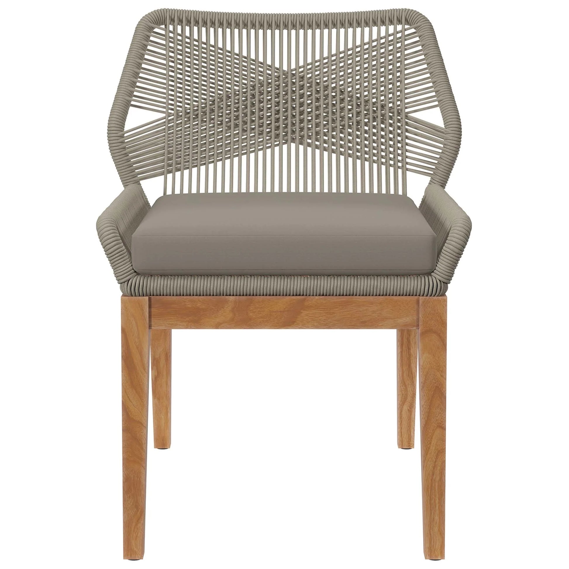 The Wellspring Outdoor Patio Dining Chair features a solid teak wood base with stretchers and an aluminum seat frame detailed with woven rope and a crisscross back pattern. Its removable seat cushion includes dense foam padding and tieβbacks for secure placement. Nonβmarking foot pins help protect flooring surfaces. Designed for outdoor use on patios, porches, and poolside areas, the chair can also be incorporated into indoor settings. Assembly is required. Weight capacity: 220 lbs. Overall dimensions are 27"D x 25"W x 32.5"H.