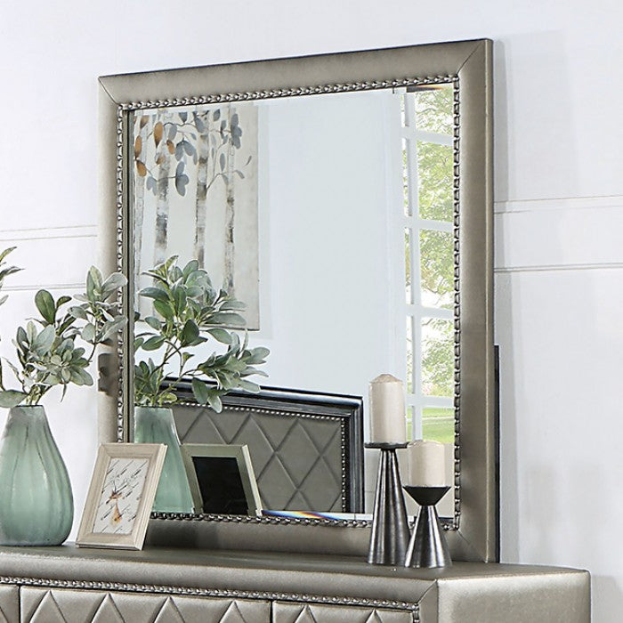 Keywords: Xandria mirror, transitional leatherette mirror, padded frame mirror, stylish wall mirror, elegant bedroom decor, modern home accents.